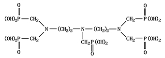 別名:二乙烯三胺五亞甲基膦酸 分子式:C9H28O15N3P5 相對分子質(zhì)量:573.2 結(jié)構(gòu)式: 一、性能與用途 DTPMPA無毒,易溶于酸性溶液中,阻垢緩蝕效果俱佳且耐溫性好,可抑制碳酸鹽、硫酸鹽垢的生成,在堿性環(huán)境和高溫下(210°C以上)阻垢緩蝕性能較其它有機膦好。DTPMPA在水處理中用作循環(huán)冷卻水和鍋爐水的阻垢緩蝕劑,特別適用于堿性循環(huán)冷卻水中作為不調(diào)pH的阻垢緩蝕劑,并可用于含碳酸鋇高的油田注水和冷卻水、鍋爐水的阻垢緩蝕劑;在復(fù)配藥劑中單獨使用本品,無需投加分散劑,污垢沉積量仍很小。 DTPMPA也可用作過氧化物穩(wěn)定劑(特別是高溫條件下雙氧水穩(wěn)定效果好)、紡織印染用螯合劑、顏料的分散劑、氧脫木素穩(wěn)定劑、化肥中微量元素攜帶劑、混凝土添加劑。此外,在造紙、電鍍、金屬酸洗和化妝品等方面也得到了廣泛應(yīng)用。還可作氧化性殺菌劑的穩(wěn)定劑。 二、技術(shù)指標 符合HG/T3777-2005